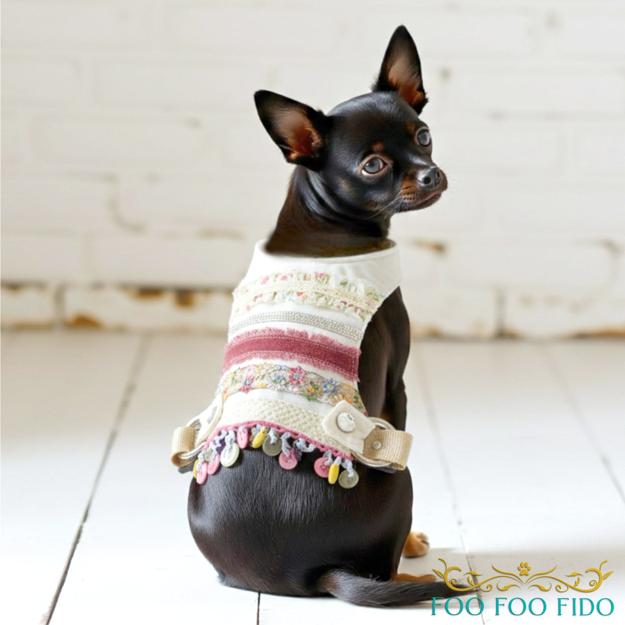 This Shabby Chic Ivory Lace Harness Vest is the perfect blend of soft elegance and everyday function. Handmade from ivory cotton and lace, and adorned with crochet trim, ribbons, pearls, crystals, and vintage-inspired details, this harness is designed for dogs who love to look fancy while staying comfortable. 🤍🐾