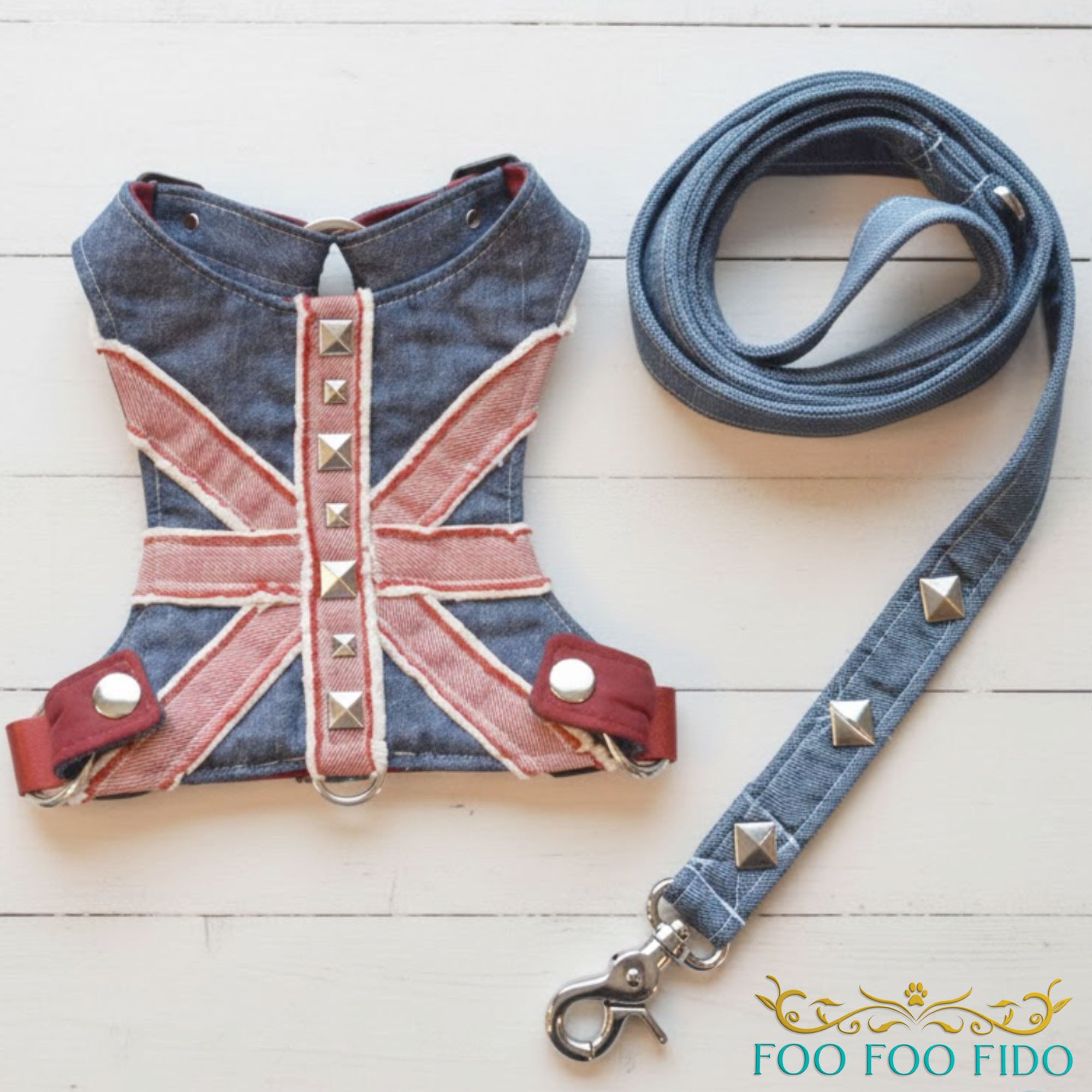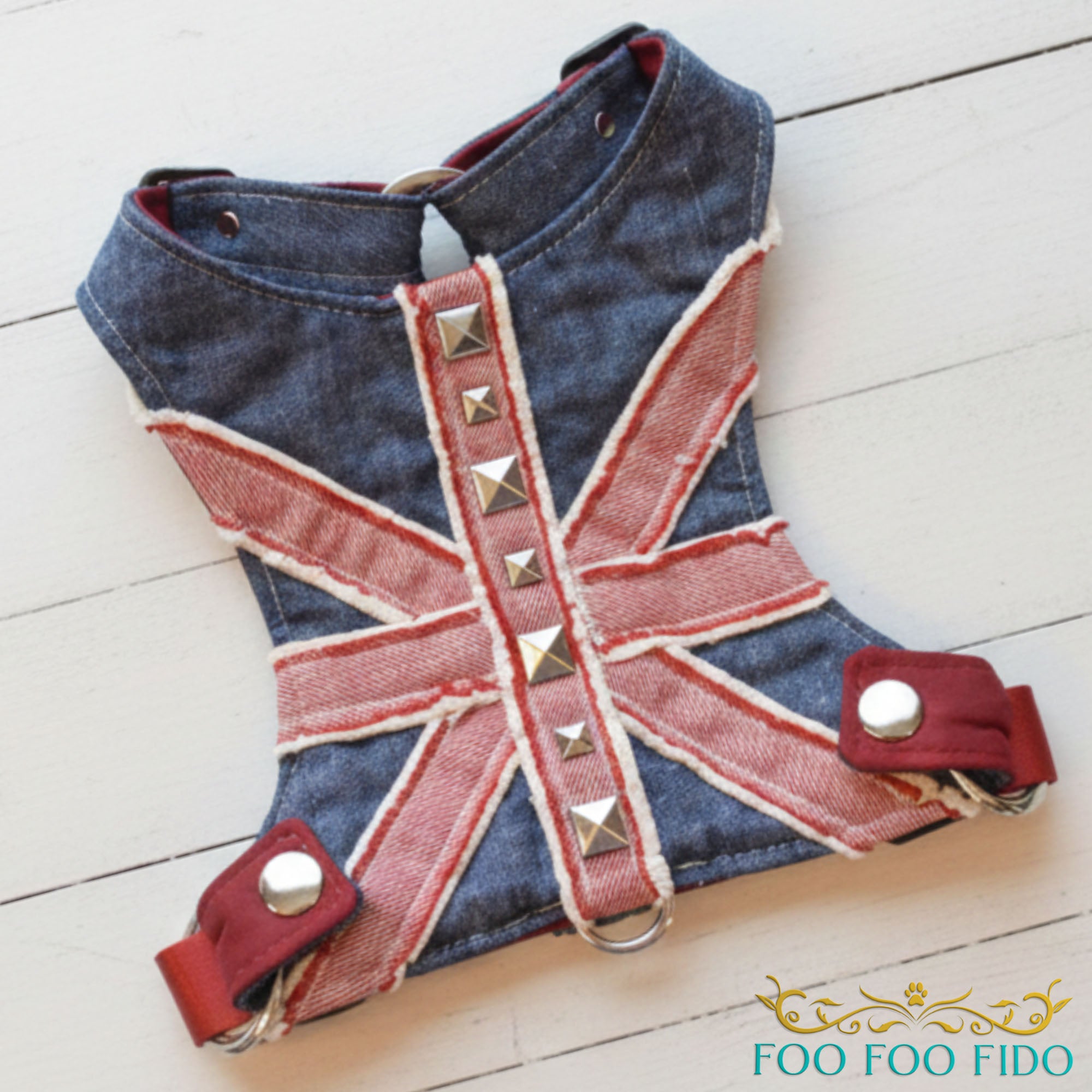 Make your pup the star of the show with our Jumpin’ Jack Flash Dog Harness—a bold, handmade vest that fuses rock-and-roll edge with everyday comfort. Handcrafted in durable dark blue denim and layered with frayed red ticking tape in a Union Jack design, this choke-free harness is perfect for concerts, parades, or pawties.