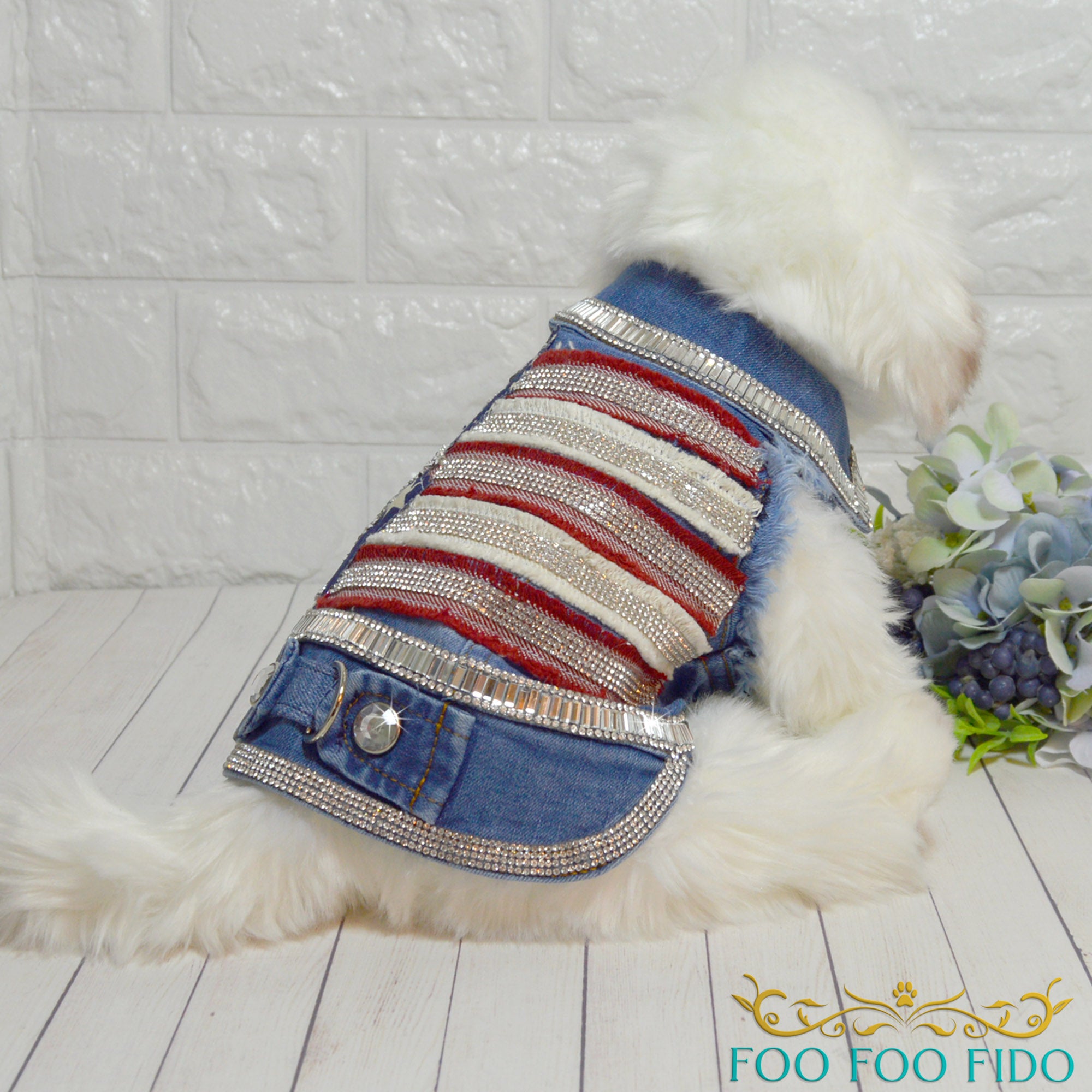 This small dog denim vest is made from high-quality denim and features a bold American flag design, complete with sparkling crystals and rhinestone stars. Itβs the ultimate look for pups who love to shine and celebrate freedom!