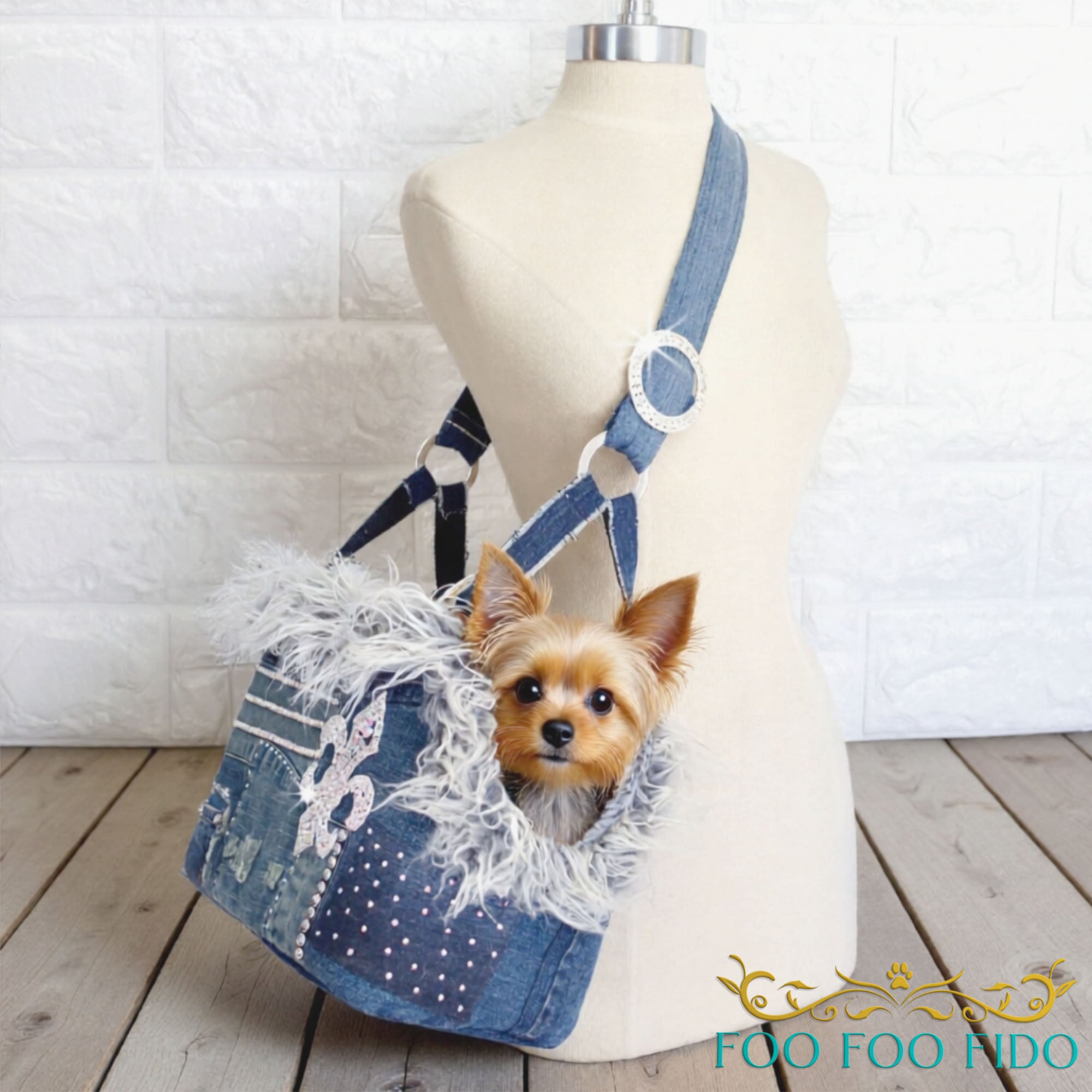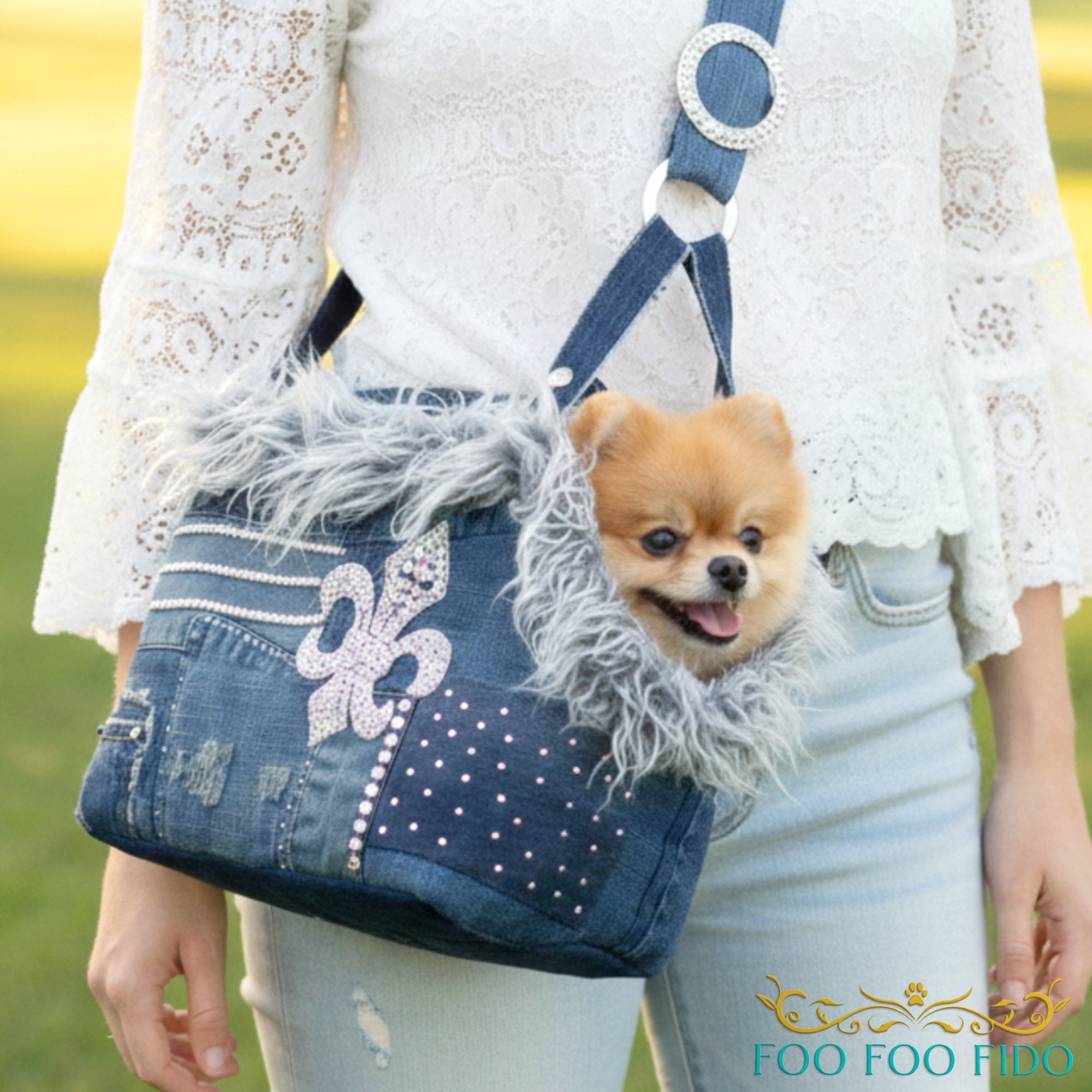 The Diva Dog Denim Fleur de Lis Carrier blends rugged, upcycled denim with sparkling embellishments for a look that’s classy, edgy, and unmistakably chic. Designed for pups who travel in style, this one-of-a-kind pet purse turns every outing into a fashion moment.