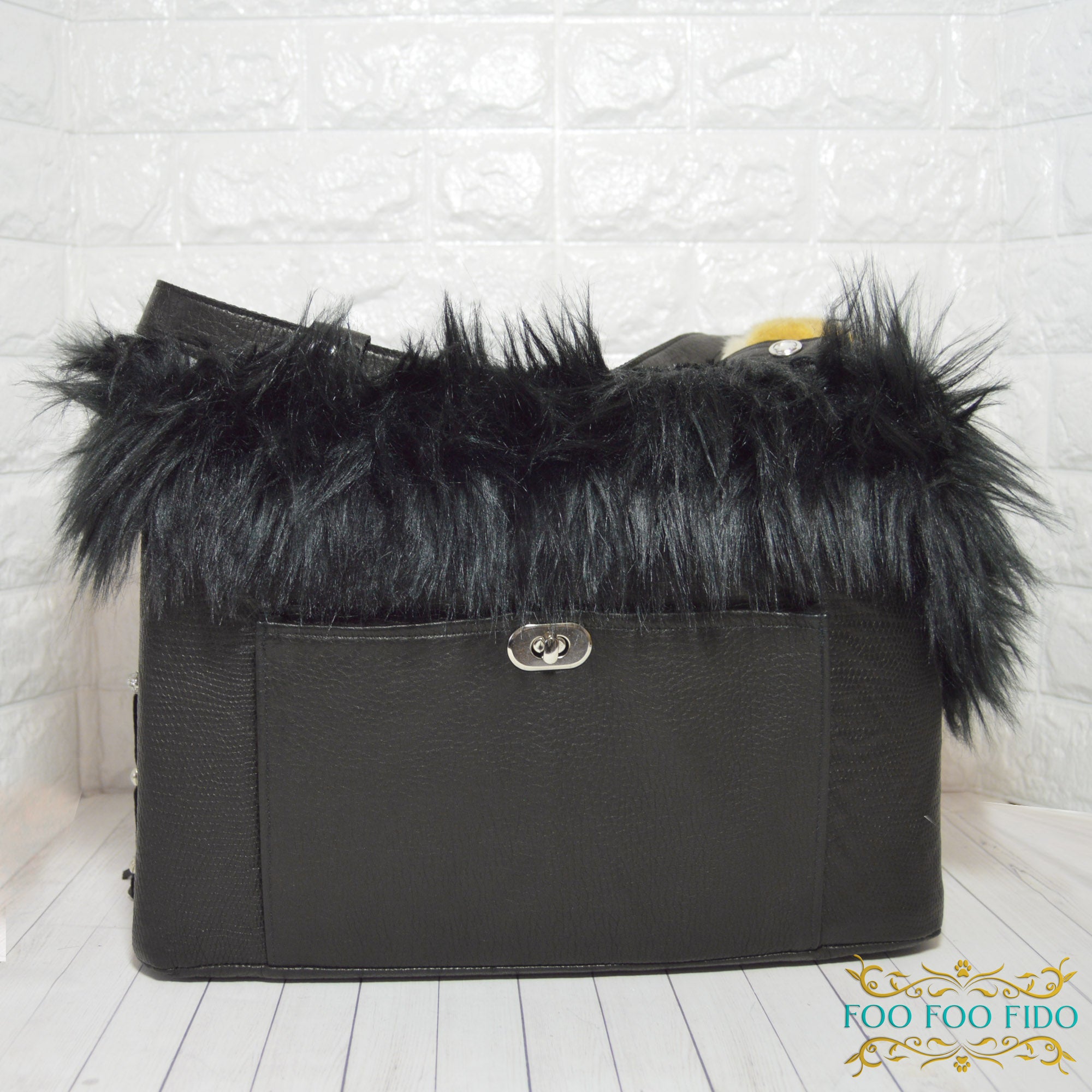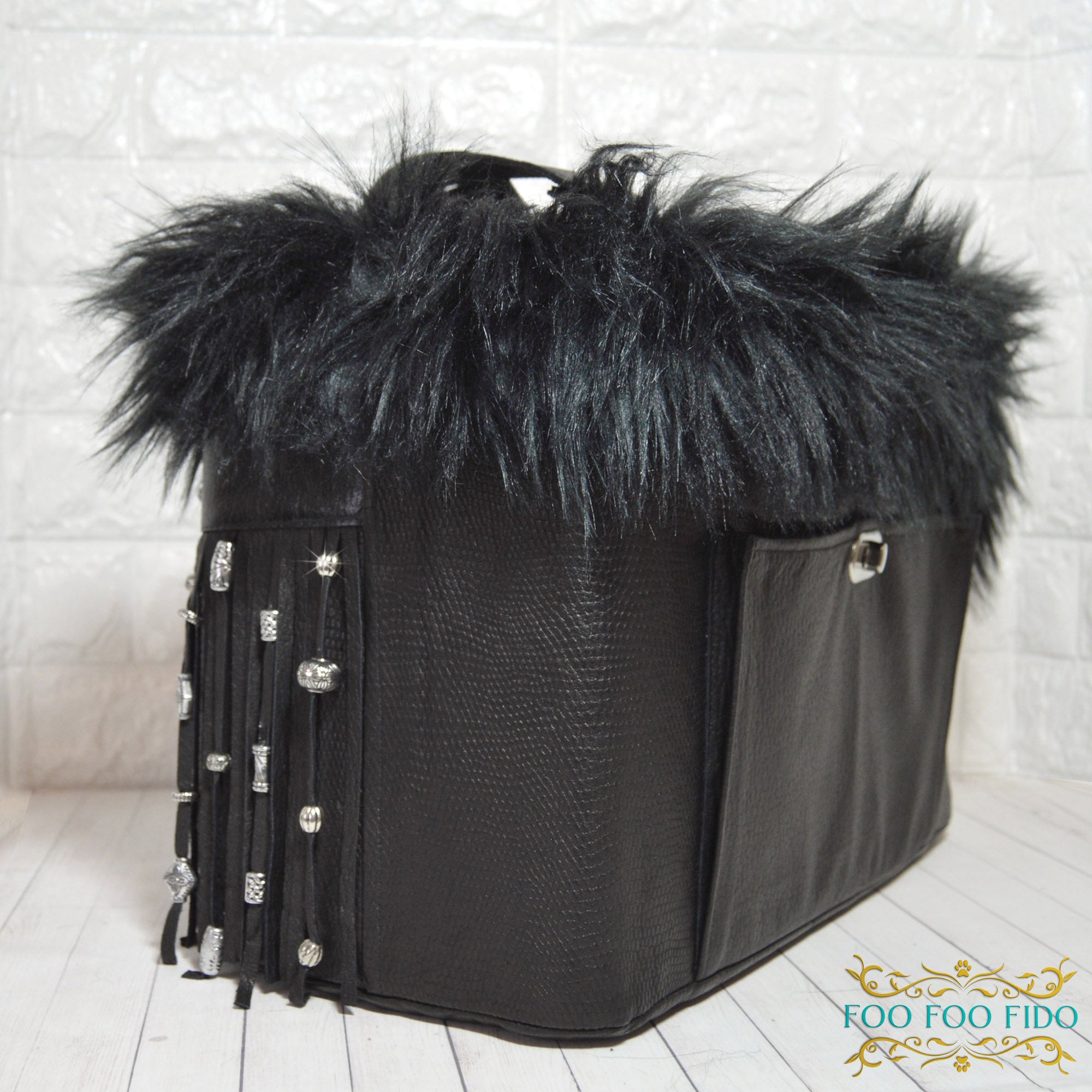 The interior features black faux fur trim,