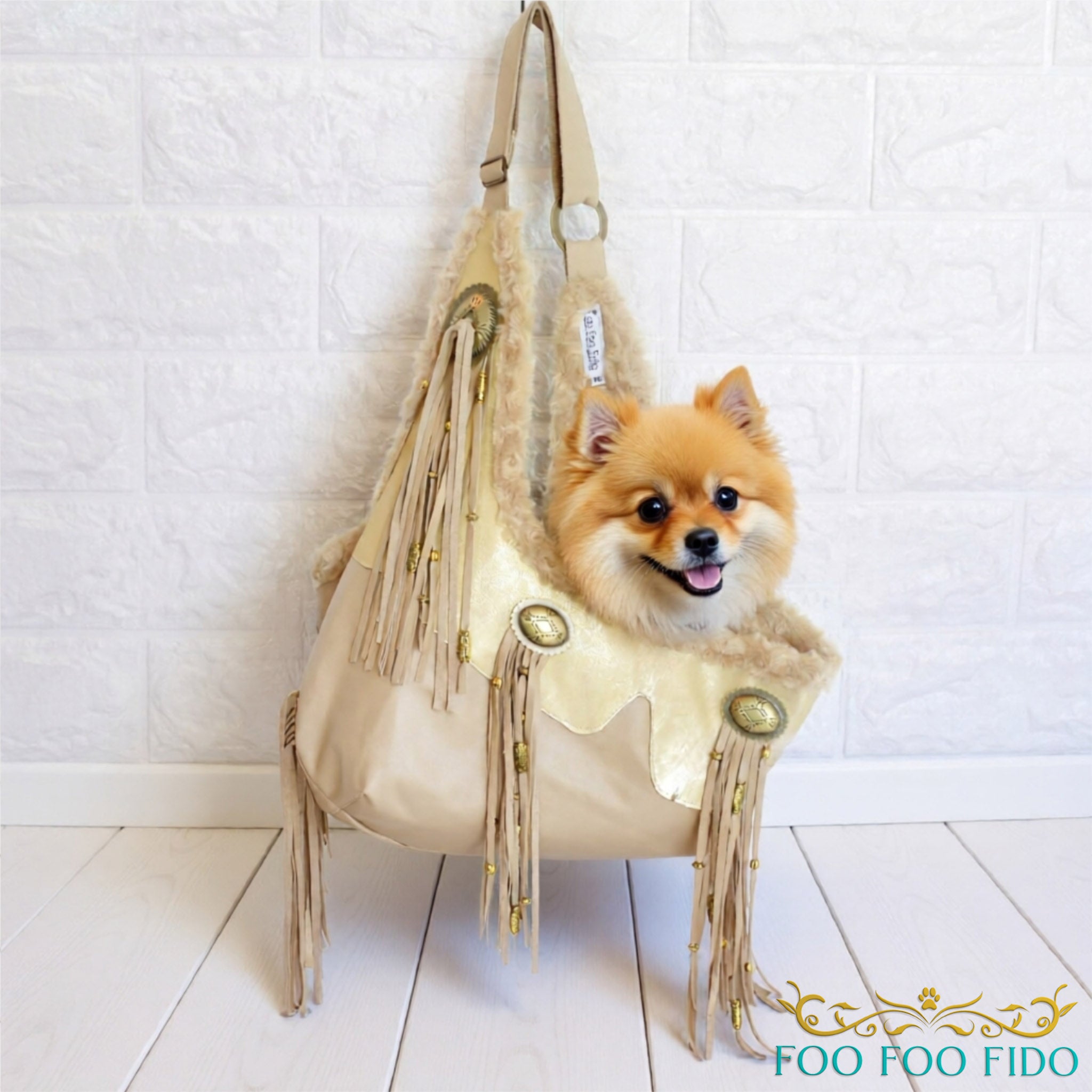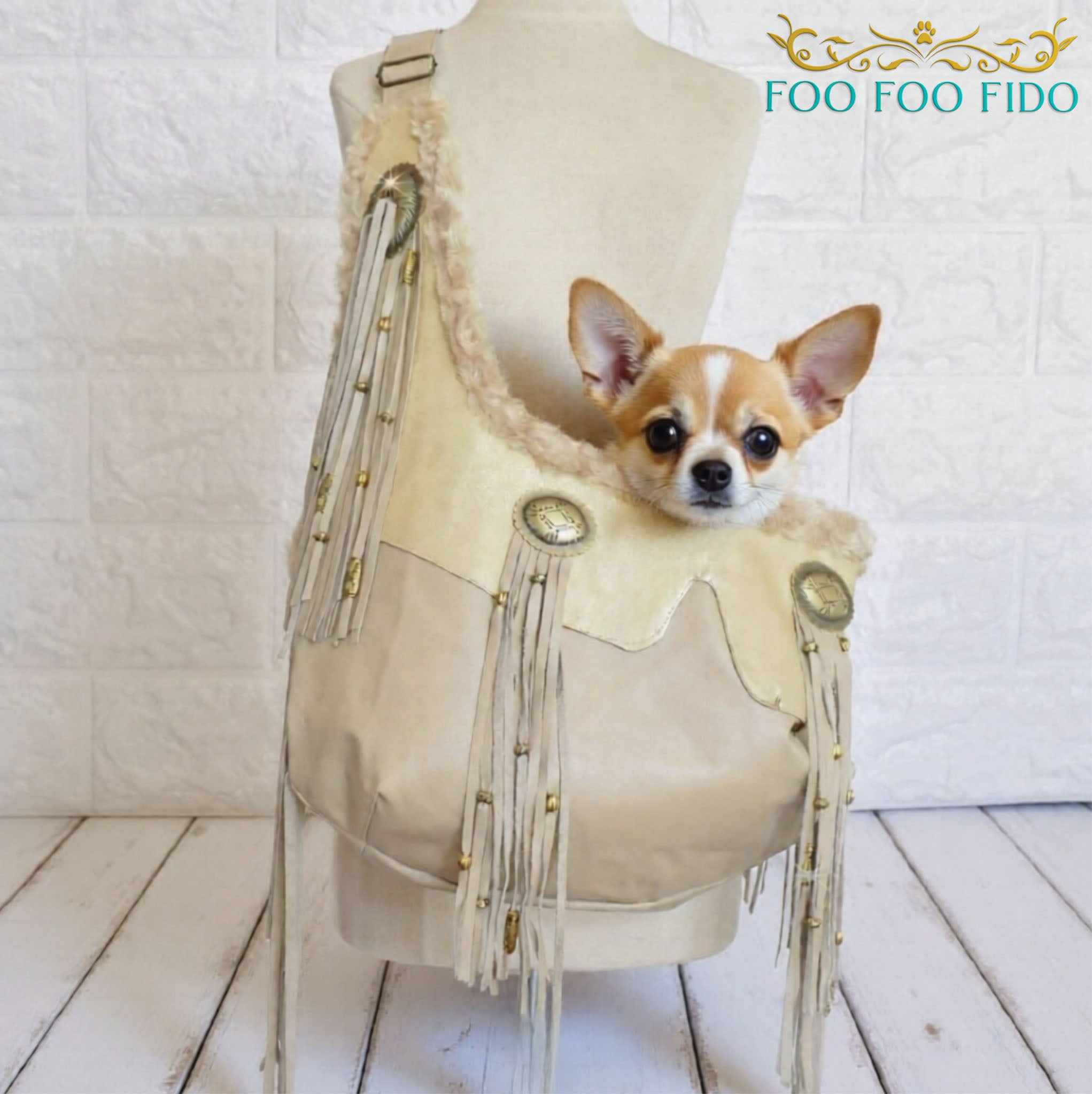 Tan Leather Fringe Dog Sling • Cowgirl Pet Carrier with Conchos