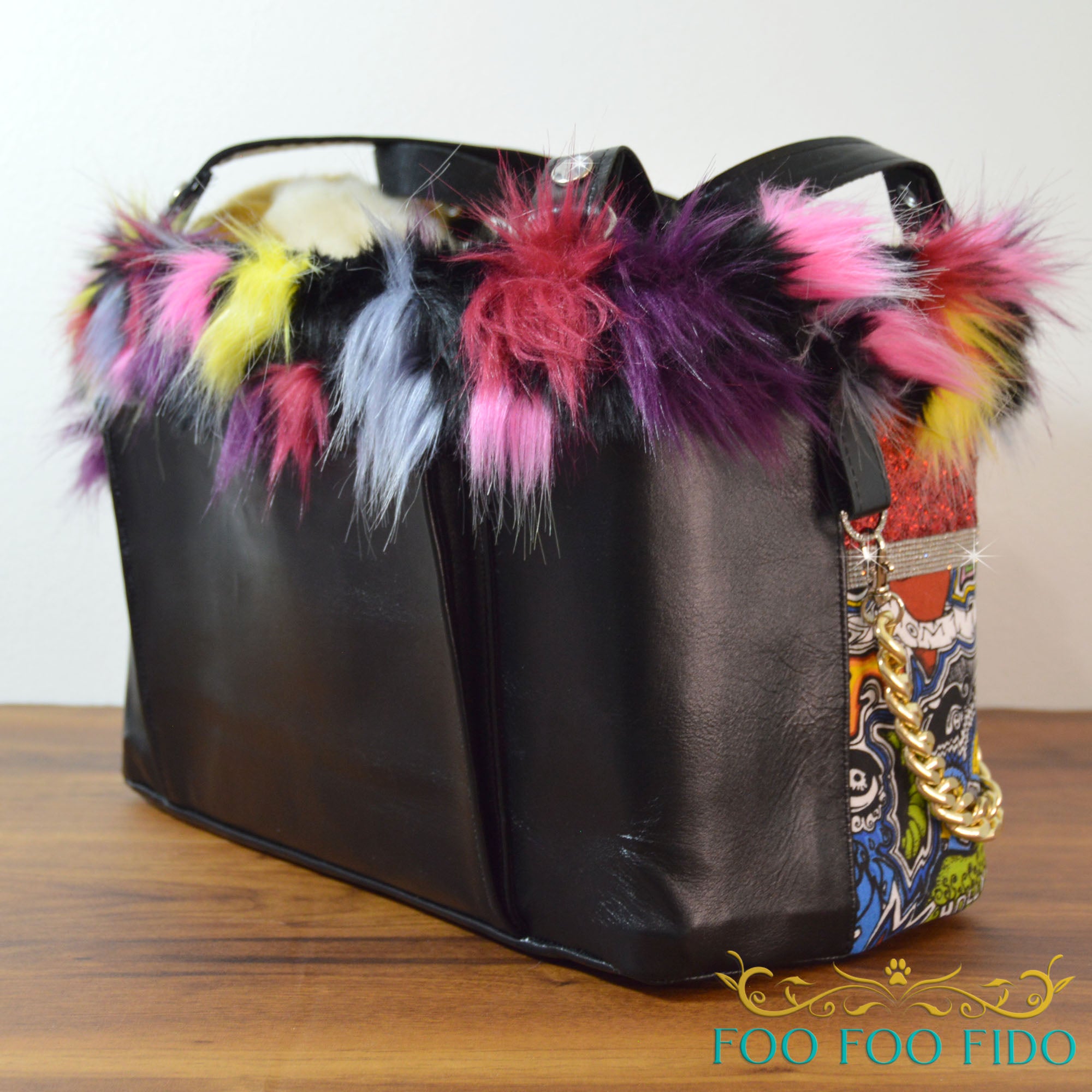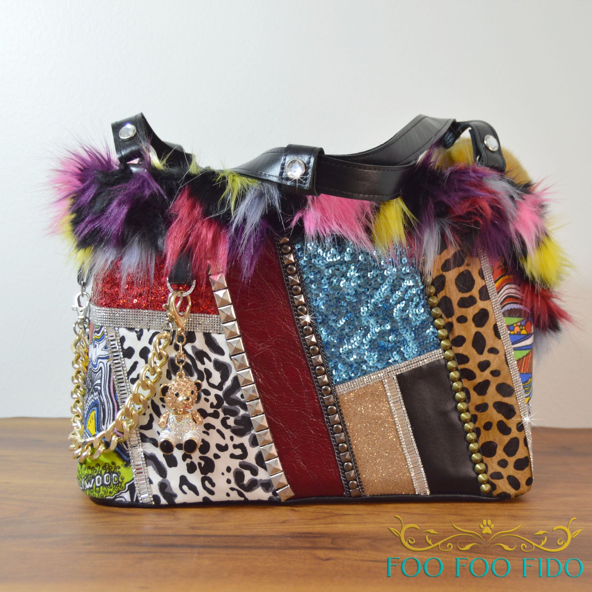 faux fur and adorned with chains, studs, charms,